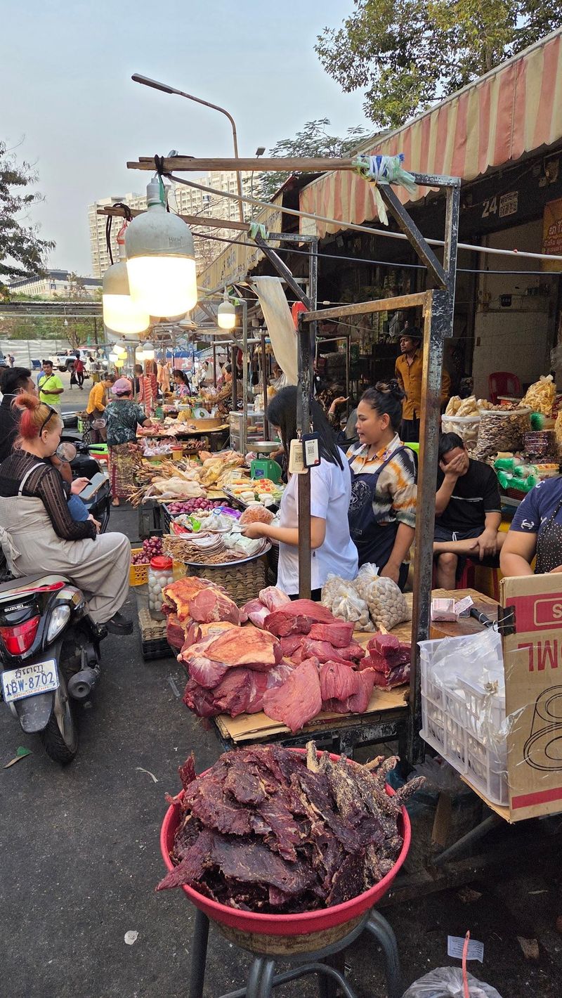 Fristande kjøt for sal. 34°C varme og insekter over alt.