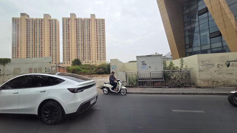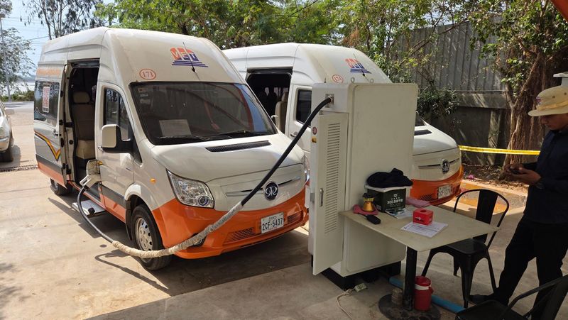 Elektrisk minibuss til lading på ein av rastestadane langs vegen til Phnom Penh.