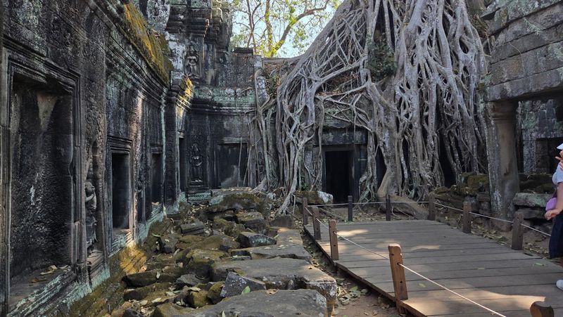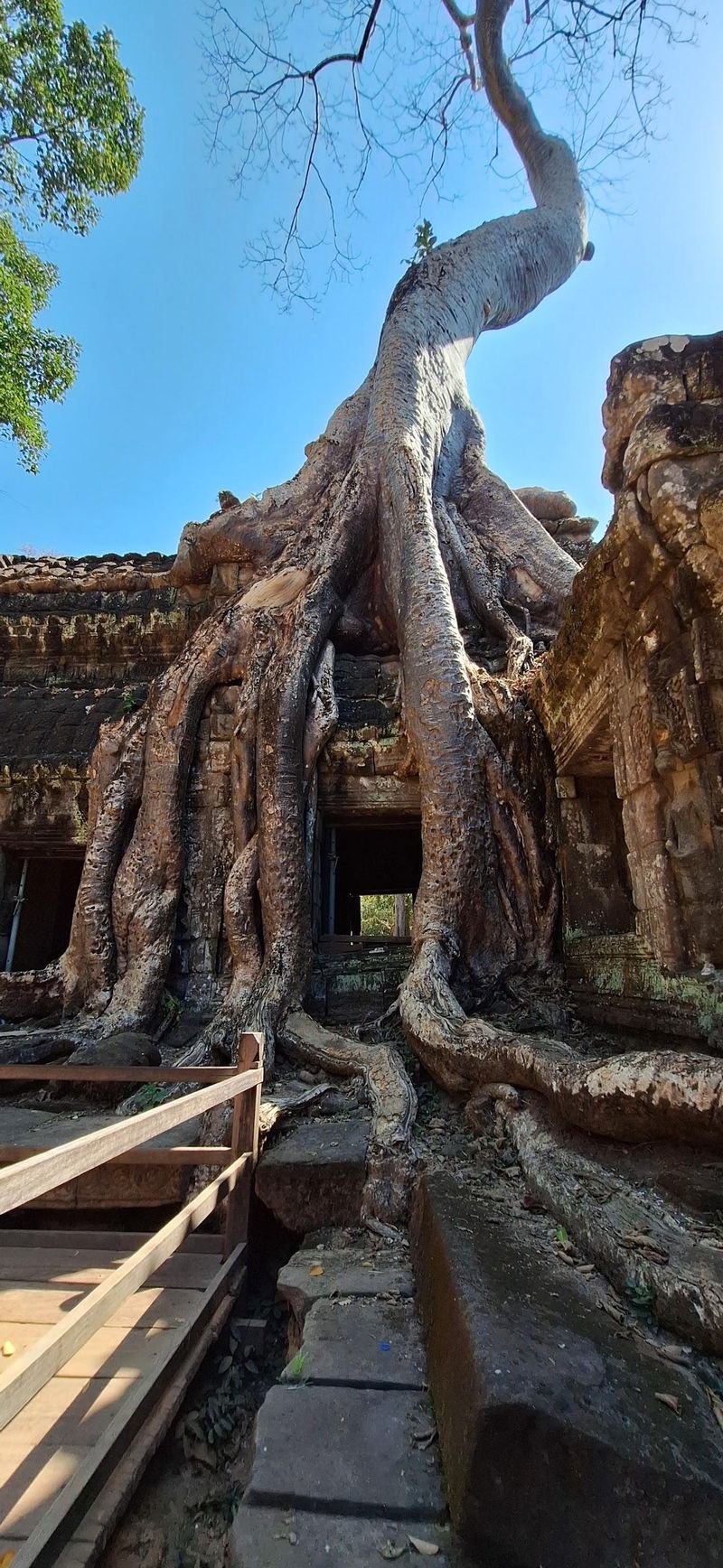 Røter som har trengt seg inn i bygningane. Dei har behalde desse i nokre av templene for å vise naturen kraft.