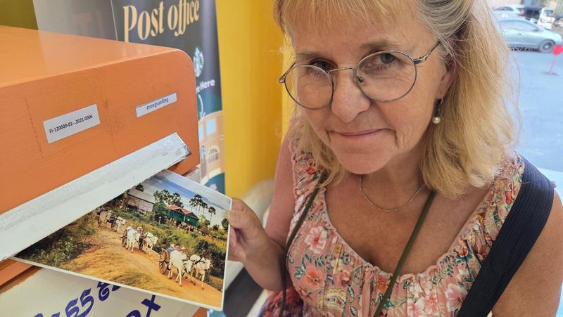 Unni sender kort heim te barnebarna.