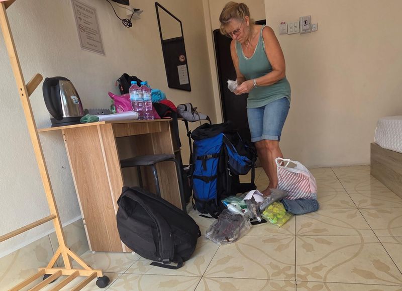 Det blei ein tidleg morgon. Hadde pakka sekkane kvelden før og var klar til frukost ved resepsjonen. Croasaint, smør, syltetøy og bananer, så mykje som med orka.