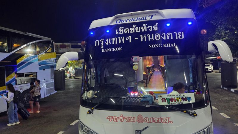 Buss blei det. Etter grensepassering med nokre utfordringar av ymse slag, tok me bussen til Bangkok. Starta kl. 19.45 og var framme klokka 05.45.